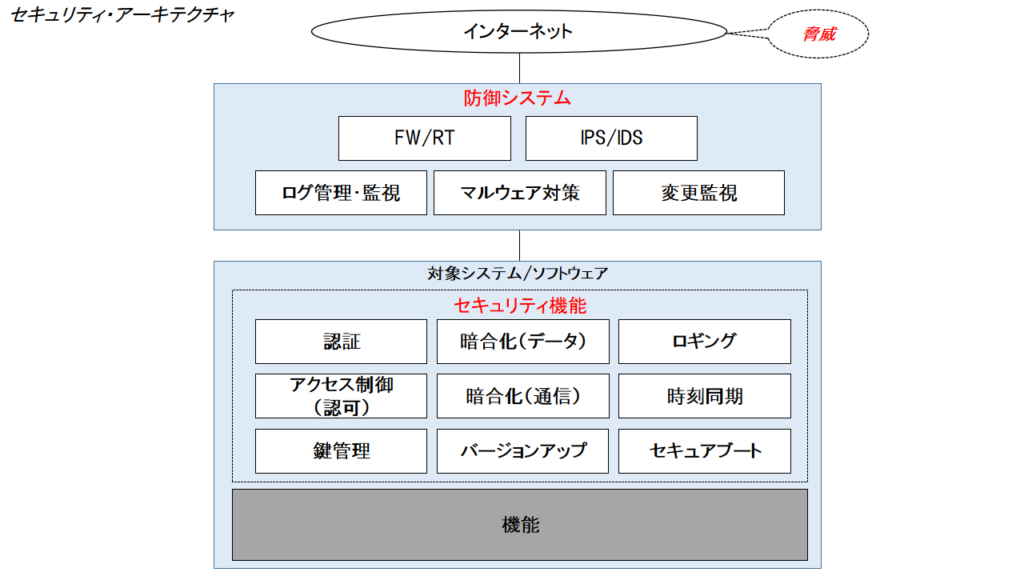 セキュリティを実現するためのアーキテクチャは、外側(防御システム)と内側(セキュリティ機能)の2つのレイヤに分けられます。対象システム/ソフトウェアを「脅威」から守るため、外側に防御システムを構築します。さらに、対象システム/ソフトウェアの内側に、セキュリティ機能を実装します。
